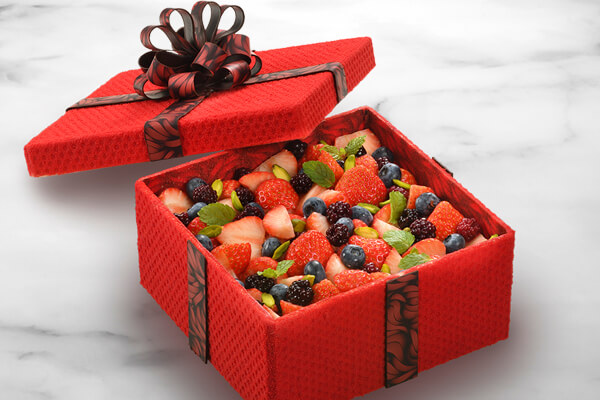 チョコレートで型取られた蓋を開けると、苺やブラックベリー、ブルーベリーなどがふんだんに乗せられたショートケーキが登場。